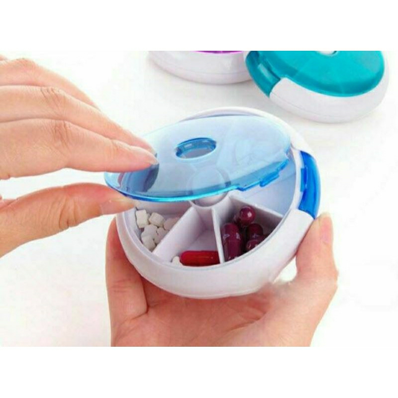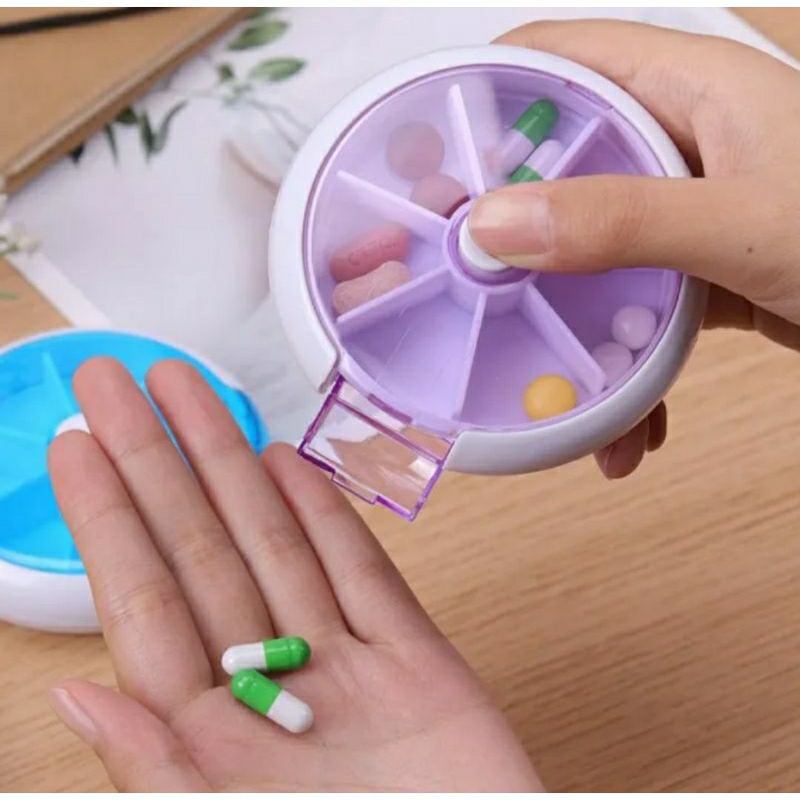 Kotak penyimpanan obat berbentuk bulat dengan 7 sekat ( untuk persediaan obat selama 1 minggu). Didesign khusus untuk pemakaian sehari hari, memudahkan untuk dibawa kemana saja. Untuk mengeluarkan obat, cukup menekan tombol pemutar yang terletak di tengah.