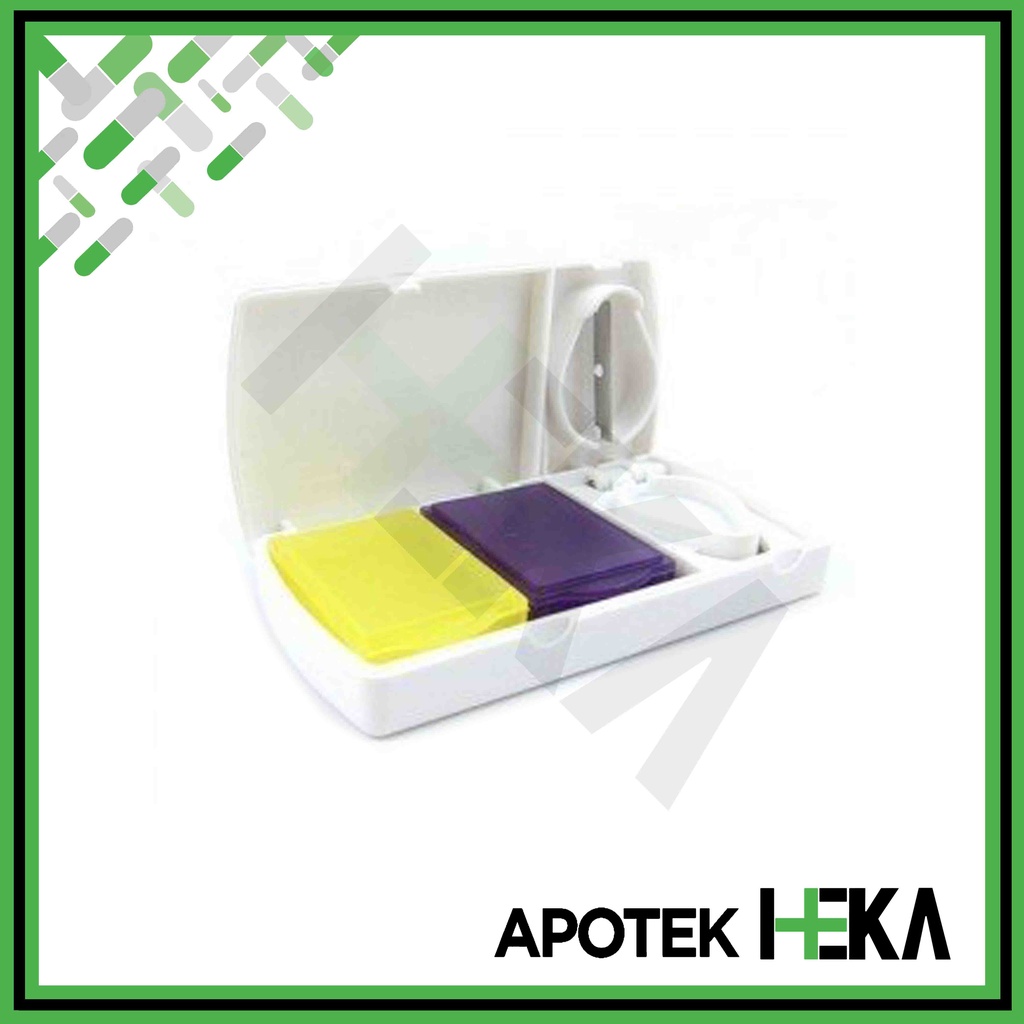 Kotak obat dengan tambahan pisau cutter kecil untuk membelah tablet menjadi dua Dalam kotak terdapat tambahan kotak transparan penyimpanan obat, warna kuning & ungu.