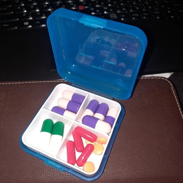 Terdapat 4 sekatan yang dapat digunakan untuk menyimpan obat/suplemen saat berpergian atau menyimpan barang lainnya seperti perhiasan.