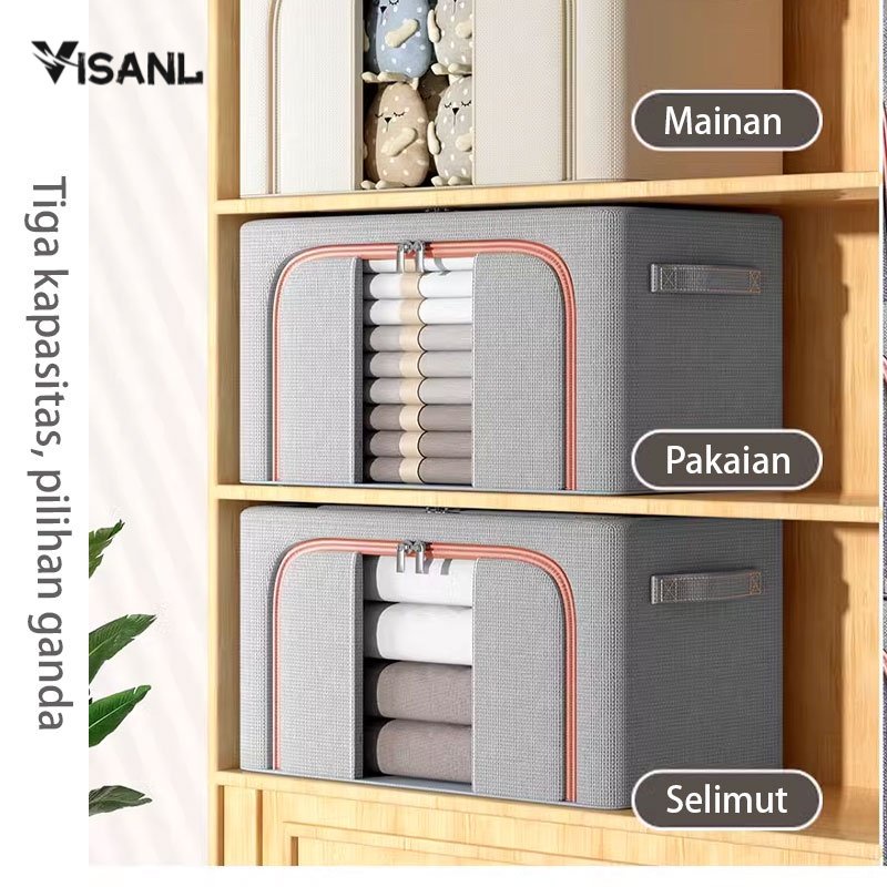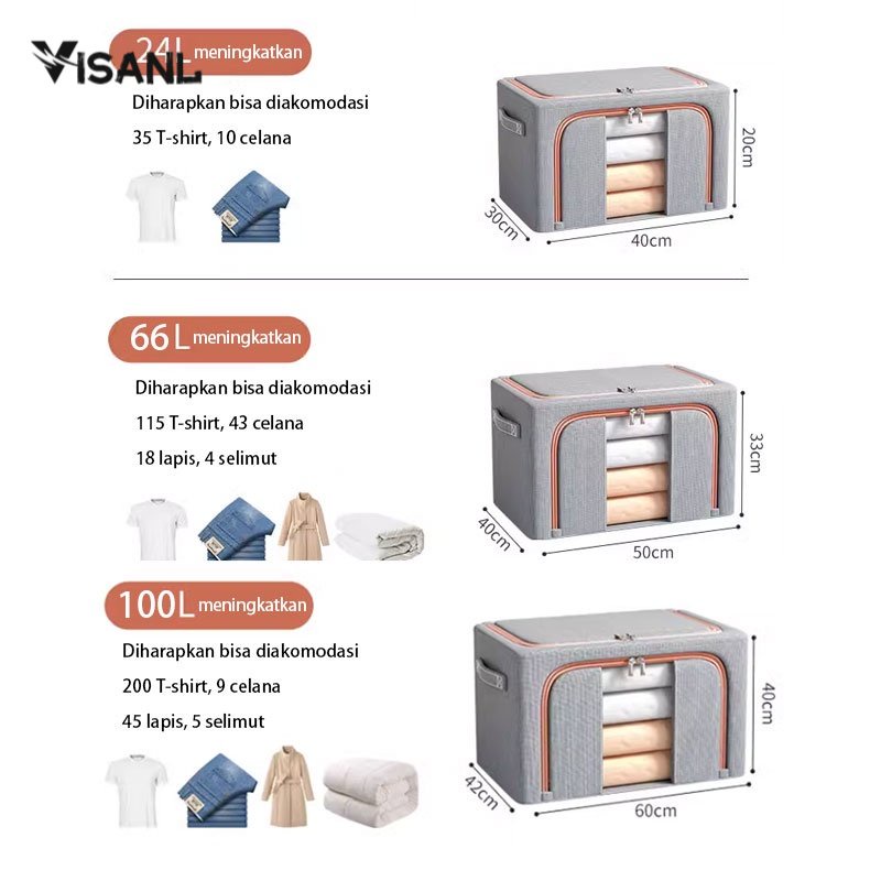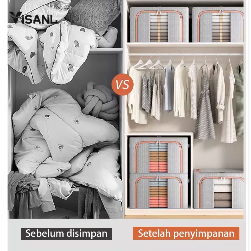box ini terdapat 2 pintu, bisa buka dari atas dan samping. Pintu atas cocok untuk mengisi pakaian atau mainan ke dalam box. Pintu depan cocok untuk mengambil pakaian keluar dari box. Sangat Praktis - Material : Oxford tebal - Style : Korean Style - Spesifikasi : rangka baja dapat dicuci - Cocok ditempatkan di lemari pakaian - Kotak penyimpanan serbaguna bisa menyimpan pakaian, selimut, mainan anak dll - Kapasitas besar dan kuat - Bahan transparant sehingga mudah terlihat - Dengan seleting ganda kuat dan aman - Dengan gagang mudah untuk di pindahkan
