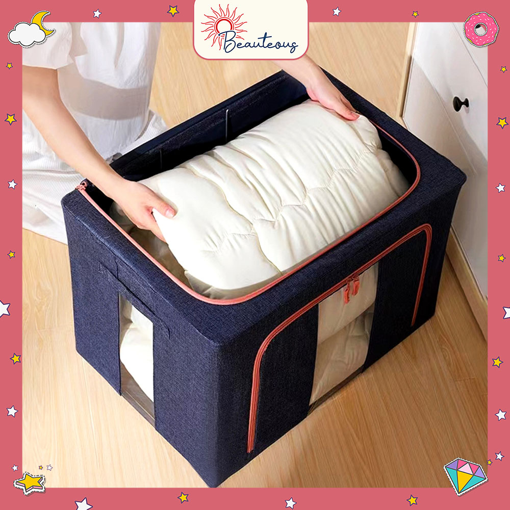 Storage box ini bersifat waterproof. Terdapat 3 ukuran kecil, besar, jumbo. Bisa digunakan untuk menyimpan baju, selimut, mainan anak, dan lainnya. Terdapat rangka besi di dalamnya yang membuat box menjadi kokoh. Dilengkapi dengan resleting di bagian atas dan bagian depan. Bisa dilipat saat tidak digunakan untuk menghemat ruang.