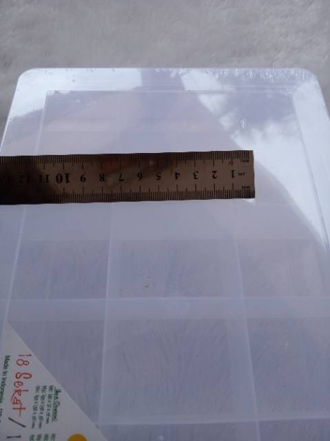 12 sekat Panjang 30*20*5 cm Warna putih bening Sekat paten Setiap sekat ukuran -+9,5*5 cm Berat sebenarnya 325 gram berat volume 500 gram. Harga yang tertera adalah harga perbiji.