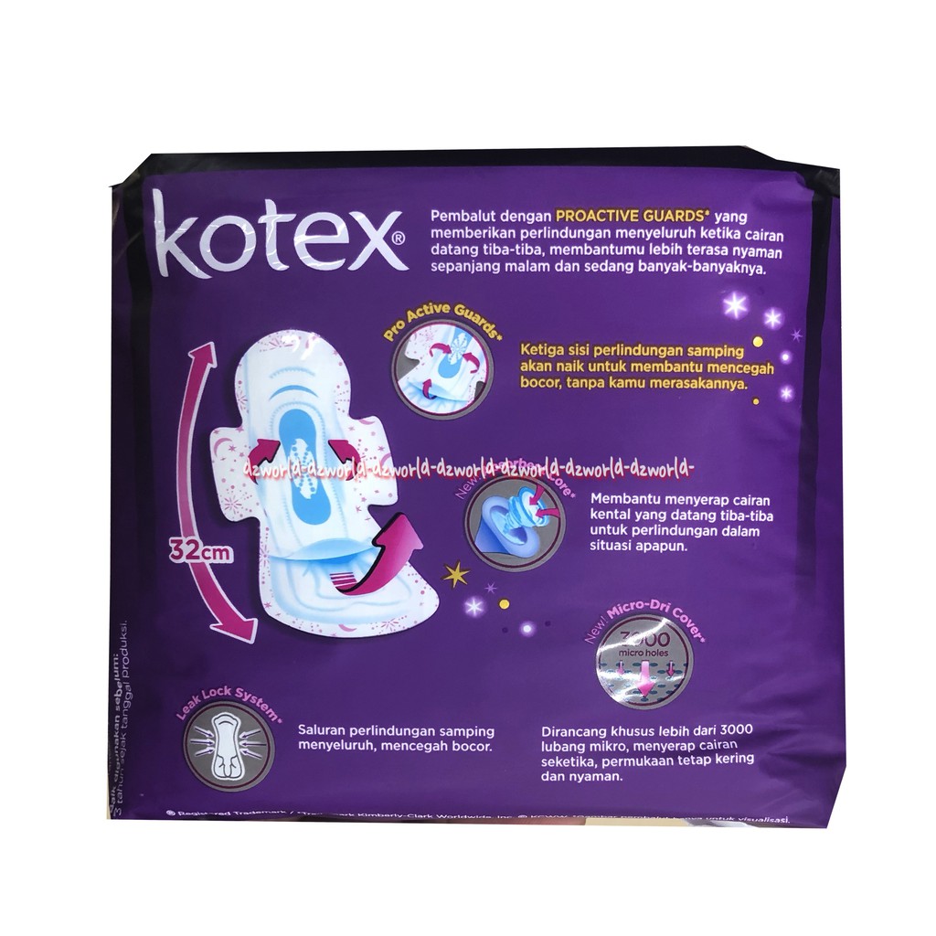 Kotex Perlindungan Total Overnight 32 cm Pembalut Wanita [9 Pads] dengan Proactive Guards Technology yang memberikan perlindungan menyeluruh ketika cairan datang tiba-tiba. Dilengkapi dengan New Absorbent Core yang dapat menyerap cairan kental yang sulit diserap sekalipun, dengan design yang dirancang mengikuti tubuh wanita dapat memberi kenyamanan sepanjang malam dan saat sedang banyak-banyaknya.