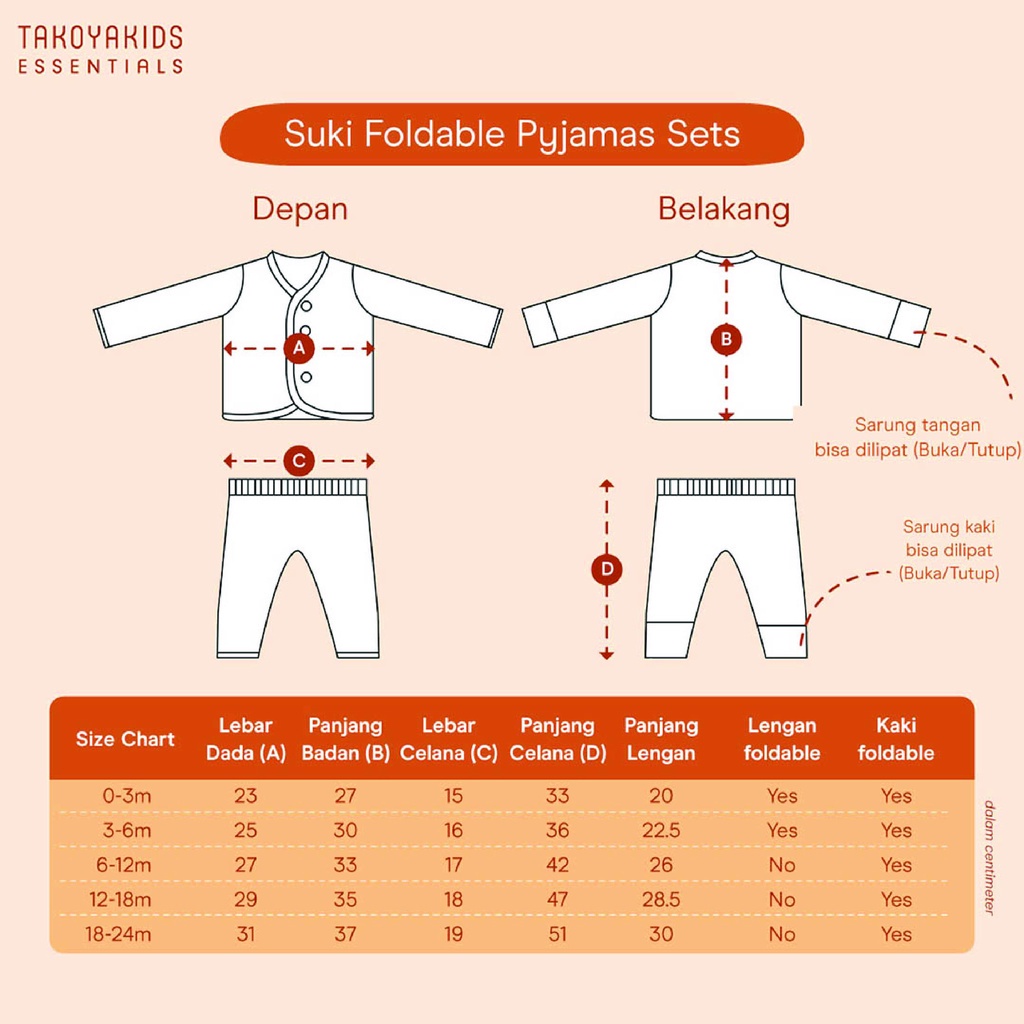 Size Chart / lebar dada / panjang badan / lebar celana / panjang celana / panjang lengan / lengan foldable / kaki foldable