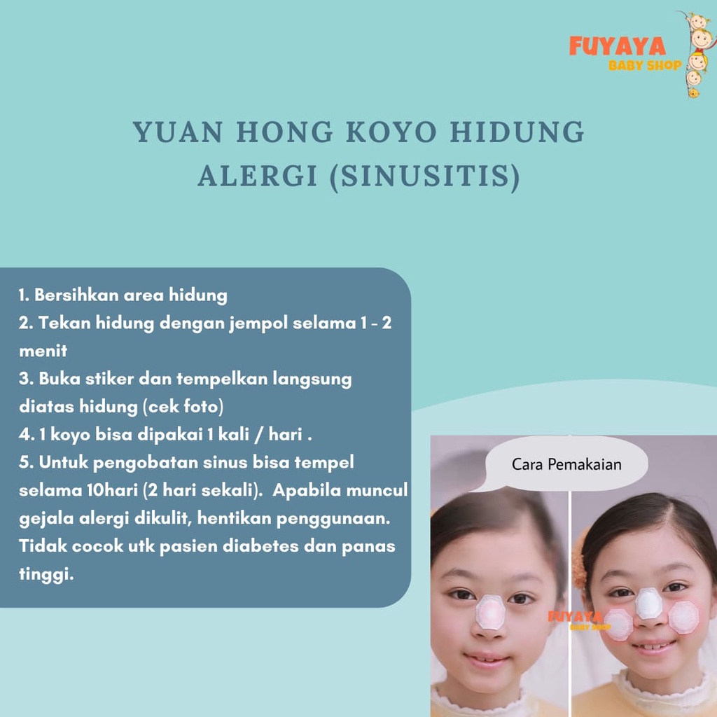 Cara pemakaian: 1. Bersihkan area hidung 2. Tekan hidung dengan jempol selama 1 - 2 menit 3. Buka stiker dan tempelkan langsung diatas hidung (cek foto) 4. 1 koyo bisa dipakai 1 kali / hari . 5. Untuk pengobatan sinus bisa tempel selama 10hari (2 hari sekali). Apabila muncul gejala alergi dikulit, hentikan penggunaan. Tidak cocok utk pasien diabetes dan panas tinggi.