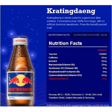 Kratingdaeng Red Bull juga meningkatkan performa tubuh, prestasi, produktivitas, dan aksi. Stamina dan kekuatan juga tingkatkan melalui minuman ini agar lebih fokus di segala situasi. Kratingdaeng Red Bull mengandung 50 mg kafein, di bawah batas harian yang dianjurkan yaitu 400 mg/hari. Untuk Kratingdaeng sudah mendapat surat izin edar dari Badan POM, maka dinyatakan aman dikonsumsi serta tidak membahayakan konsumennya. Senyawa atau zat aktif yang terdapat di dalamnya justru memberikan manfaat bagi yang mengkonsumsinya Kratingdaeng vitamin apa? TAKARAN PER SERVING : % AKG: Energi 100kkal, protein 1.5g, lemak 0g, karbohidrat 25g, niacinamide (vitamin B3) 20mg, pyrodoxine (vitamin B6) 5mg, cyanocobalamine (vitamin B12) 5mcg.