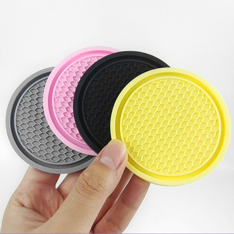 Spesifikasi spesifikasi spesifikasi. Bahan Silikon: Silikon Warna: pink, biru, hitam, kuning, abu-abu, merah Ukuran: diameter sekitar 6.8cm, ketebalan sekitar 5mm Gunakan: Isolasi panas, cocok untuk tempat cangkir mobil, rumah tangga, dll. Jumlah: 1 pc