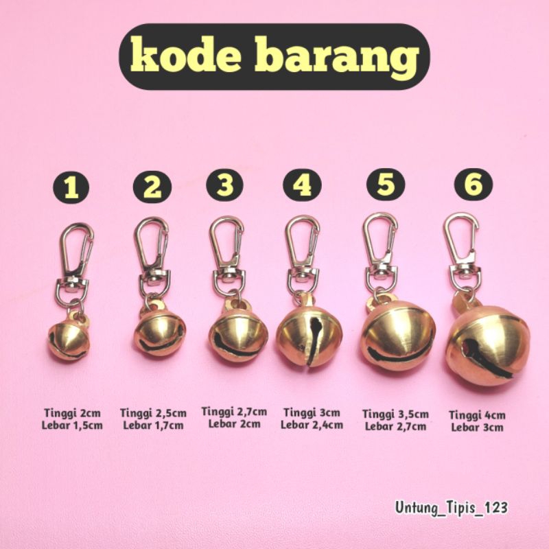 KETERANGAN PRODUK : - Barang Sesuai Gambar - Harga Satuan - Udah pakai Cantelan gantungan kunci - Ada 6 ukuran silahkan pilih - Bahan Aseeliiii Kuningan bukan kaleng - Suara di Jamin nyaring - Ukuran Makin Besar Suara Makin Kencang - Mengenai ukuran Silahkan perhatikan lagi gambar