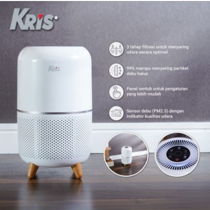 3 tahap filtrasi : Pre filter Activated carbon HEPA 13 Dilengkapi : Indikator kualitas udara Dust Sensor (PM2.5) Indikator penggantian filter Auto mode Timer Mode malam Panel sentuh Kaki kayu Lampu malam Desain ringkas Masa pakai filter : 12 bulan Kompatibel dengan part filter : Kris Sparepart Multifilter Hepa H13 Cakupan area : 18m² CADR (Clean Air Delivery Rate) : 150m3/h Konsumsi daya : 30-35 watt Tegangan listrik : 220-240 V Dimensi produk : 21.5 x 21.5 x 36.5 cm Warranty Part : 12 Months Warranty Service : 12 Months Hadirkan udara yang lebih sehat di dalam ruangan dengan penjernih udara Kris. Penjernih udara dapat menyaring partikel debu yang halus dan tidak terlihat dengan 3 tahapan filtrasi yaitu pre filter, activated carbon, HEPA 13, dan menggantinya dengan udara yang lebih bersih dan bebas debu. Penjernih udara menggunakan panel sentuh untuk kemudahan pengaturan dan kaki yang terbuat dari kayu untuk penampilan yang lebih elegan. Anda juga dapat menggunakannya sebagai lampu tidur pada malam hari.