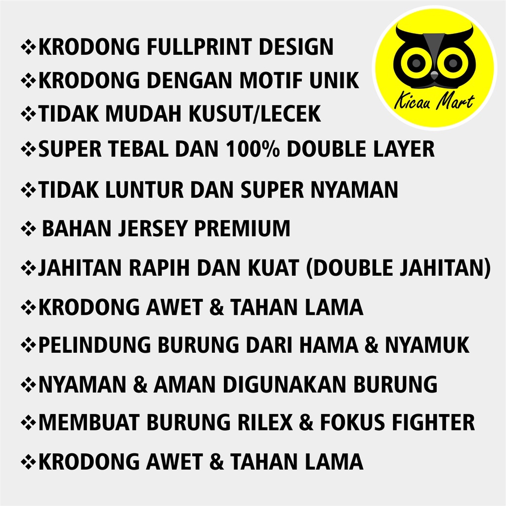 Krodong sangkar burung Kotak No 1 bahan Jersey Premium FullPrint Full printing design, menggunakan mesin khusus Tidak luntur, tidak bau, dan bahan tidak mudah lecek Sebagai media klambu sangkar & mode jemur Nyaman & Adem Tidak Panas Awet & Tahan Lama Bisa melindungi dari berbagai ancaman binatang predator Untuk memuluskan besutan mereka melenggang ke tangga juara Untuk meredam daya fighter burung selama dirumah, perjalanan atau dilapangan Nyaman Di Pakai Saat Kondisi Cuaca Apapun Material Asli Dry Fit Jahitan Rapih , Pabrikasi , Kuat Layer Dalam menggunakan Bahan Yang sangat adem berfungsi menahan panas selain memberi efek nyaman