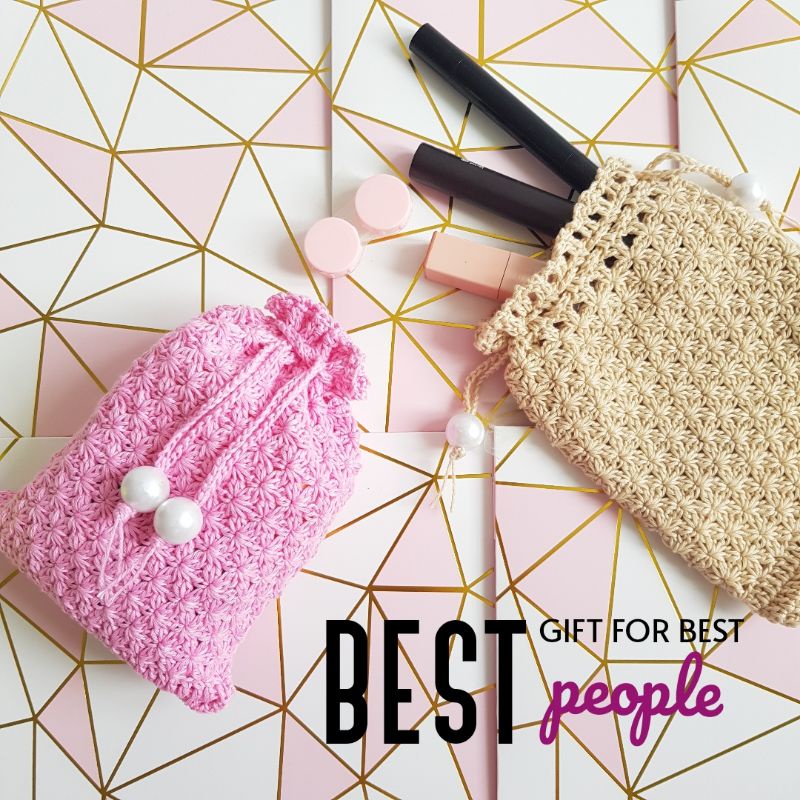 Pouch rajut dengan kualitas premium yang mempunyai tali serut dilengkapi dengan bead mutiara. Tersedia warna-warna cerah, bisa dipakai sendiri untuk pouch atau menjadi bingkisan eksklusif. Bahan rajut tidak berbulu.