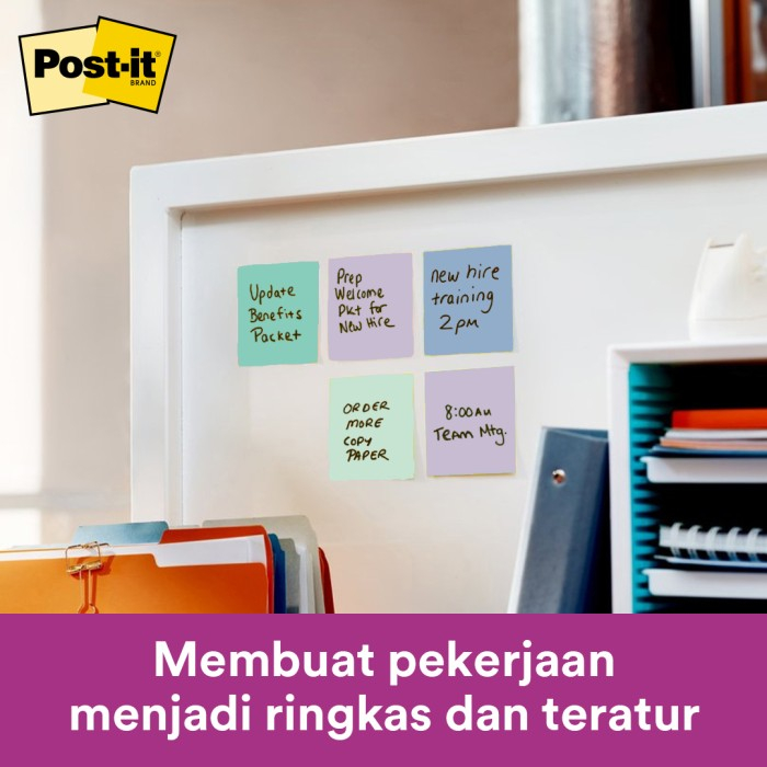Post-it Super Sticky Notes Memo Sweets 654-SS SWT / 4 Pad 3x3" 90 sheets/lembar • Dapat menempel berulang kali. • Ideal ditempel pada permukaan kertas. • Tersedia dengan lima ragam warna dalam satu kemasan: Sunnyside, Fresh Mint, Orchid Frost dan Positively Pink. • Tidak meninggalkan bekas perekat. • Tetap menempel meskipun ditempel pada permukaan kertas yang melengkung. • Kertas pada Post-it® Original Notes berasal dari hutan yang tersertifikasi, dan diolah secara bertanggung jawab.