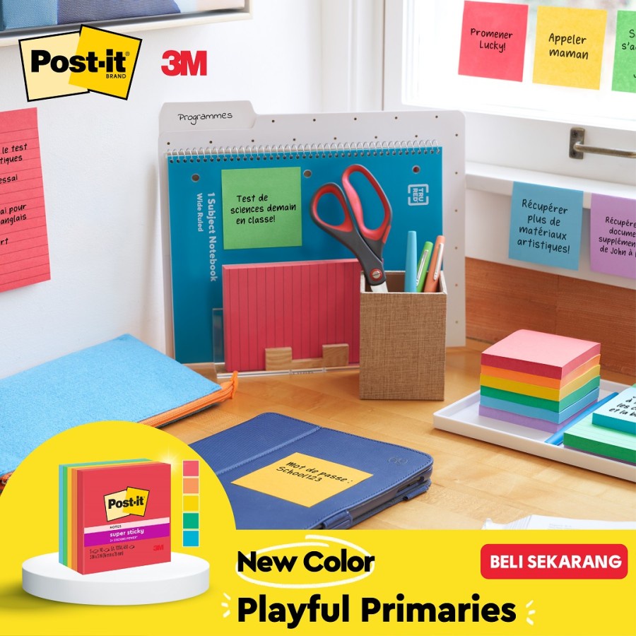 Post-it Super Sticky Notes Playful Primaries merupakan Memo Tempel 3x3" berisikan 5 pad, tiap pad berisikan 90 lembar.