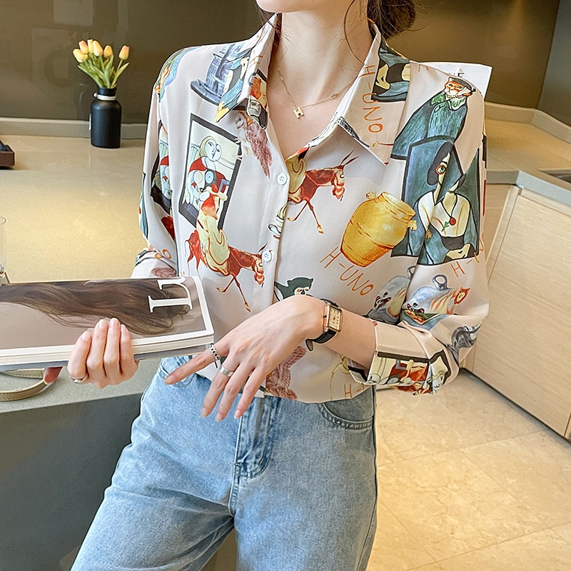 Detail Kualitas Tinggi New 2023 Fashion Gaya Cetak Lukisan Cat Minyak Kemeja Wanita Lengan Panjang Pekerjaan Kasual Kemeja Musim Panas Musim Gugur