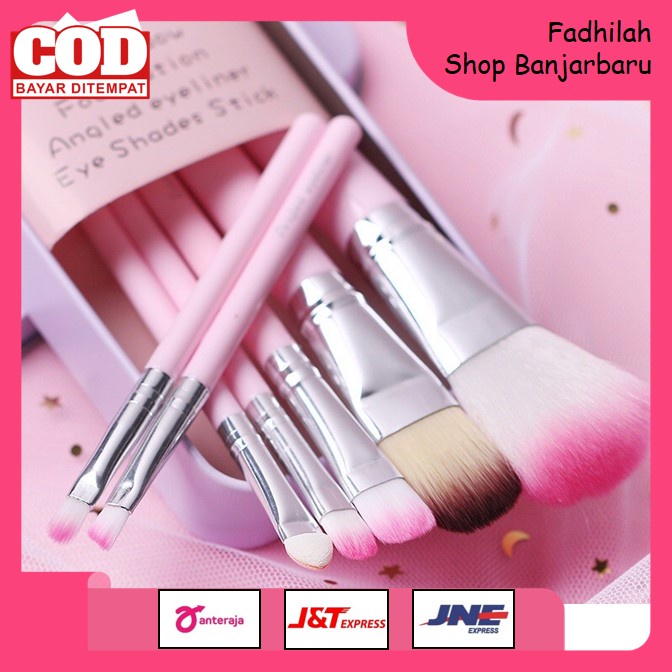 perlu diketahui โ make up 7 in 1 ini terdiri dari : face brush berfungsi untuk mengaplikasikan bedak pada wajah. bulu kuas yang tebal berfungsi meratakan bedak sehingga mengurangi risiko bedak terlalu tebal di wajah foundation brush berbentuk pipih dengan ujung bulu yang mencembung. kuas ini berguna untuk mengaplikasikan foundation, concelar, maupun bb cream agar hasilnya lebih rata. eyeshadow brush kuas ini berfungsi sebagai pembentuk sudut mata. eyeshadow stick dilengkapi dengan sponge aplikator untuk mengaplikasikan eyeshadow pada kelopak mata angled eyeliner ujung runcing pada bulu kuas ini sangat cocok untuk mengaplikasikan eyeliner pada sudut dan lipatan kelopak mata. shader berfungsi untuk mengaplikasikan shading pd tulang hidung / bagian wajah lain lip bentuk kuas yang tipis dirancang untuk membentuk garis bibir agar lebih tepat. mengatur intensitas warna lipstik sesuai keinginan