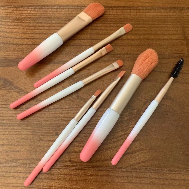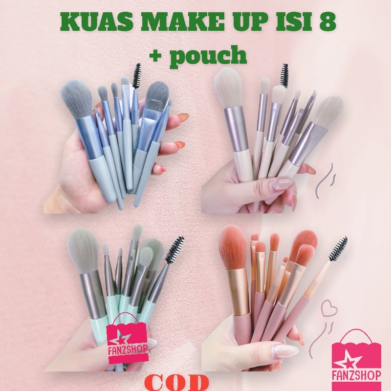 1 Set terdiri dari 8 Kuas: -Blush Brush -Foundation Brush -Eye Shadow Brush -Eye Smudge Brush -Nasal Shadow Brush -Brow Brush -Lip Brush -Eyelash Co