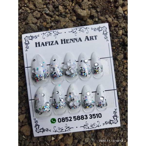 kuku palsu putih cantik hiasan swarowski dn bunga acrilic lengkap dgn lem