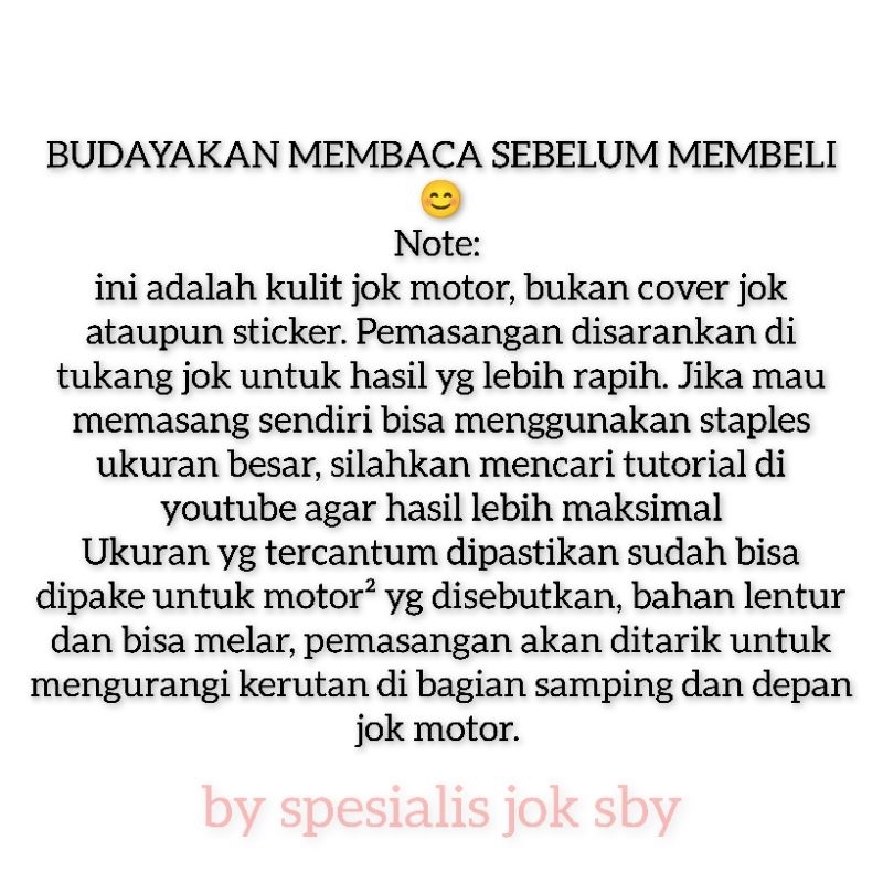 BUDAYAKAN MEMBACA SEBELUM MEMBELI 😊 Note: ini adalah kulit jok motor, bukan cover jok ataupun sticker. Pemasangan disarankan di tukang jok untuk hasil yg lebih rapih. Jika mau memasang sendiri bisa menggunakan staples ukuran besar, silahkan mencari tutorial di youtube agar hasil lebih maksimal Ukuran yg tercantum dipastikan sudah bisa dipake untuk motor² yg disebutkan, bahan lentur dan bisa melar, pemasangan akan ditarik untuk mengurangi kerutan di bagian samping dan depan jok motor.