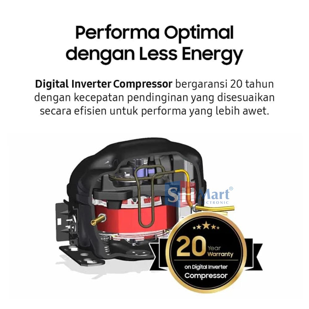 Performa Optimal dengan Less Energy Digital Inverter Compressor bergaransi 20 tahun Nikmati energi yang lebih efisien, lebih sunyi dan performa lebih lama. Digital Inverter Compressor secara otomatis menyesuaikan kecepatan sesuai permintaan pendingina, menggunakan energi lebih kecil dan lebih awet dengan garansi 20 tahun*.