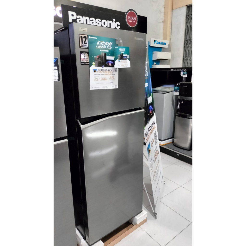SPESIFIKASI Kapasitas Kotor (IEC 62552 -2007) Total 224L Kapasitas Penyimpanan (IEC 62552-2007) Total 182L Kompartemen Pendinginan 128L Kompartemen Pembeku 54L Kompartemen Sayuran 16L Kompartemen Chilled Case 6.7L Kompartemen Es 0.172L Ukuran Produk (WxDxH) 525 x D 583 x H 1,525 Jenis Tanpa Bunga Es Y Standar / Regulasi SNI IEC 60335-1:2009; SNI IEC 60335-2-24:2009 Pemakaian Energi 232 kWh/year Tingkat Kebisingan (JIS C 9607) 27 dB Berat 45 kg Tegangan 220V Frekuensi 50 Hz Jumlah Pintu 2 Warna Pintu Glory Grey Bahan Pintu Metal KOMPARTEMEN LEMARI ES (PC) Material Baki Tempered Glass Kantung di Pintu Y Baki Telur Y (10 Holes) Ruang Pembekuan Prime Fresh / Pilihan Dingin - Ruang Chiller Y KOMPARTEMEN PEMBEKU (FC) Kotak Pembeku - Pembuat Es Otomatis - Baki Es Y KOMPARTEMEN SAYURAN (VC) Kotak Sayuran Y Laci Y Sudut Botol - Filter Kontrol Kelembapan - LAINNYA ECONAVI Y Gas Bahan Pendingin R600a Material Isolasi Termal Cyclopenthane U-Vacua - nanoe X - Anti-bakteri Ag Clean