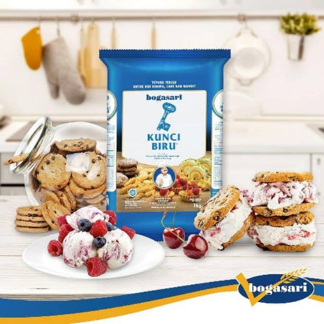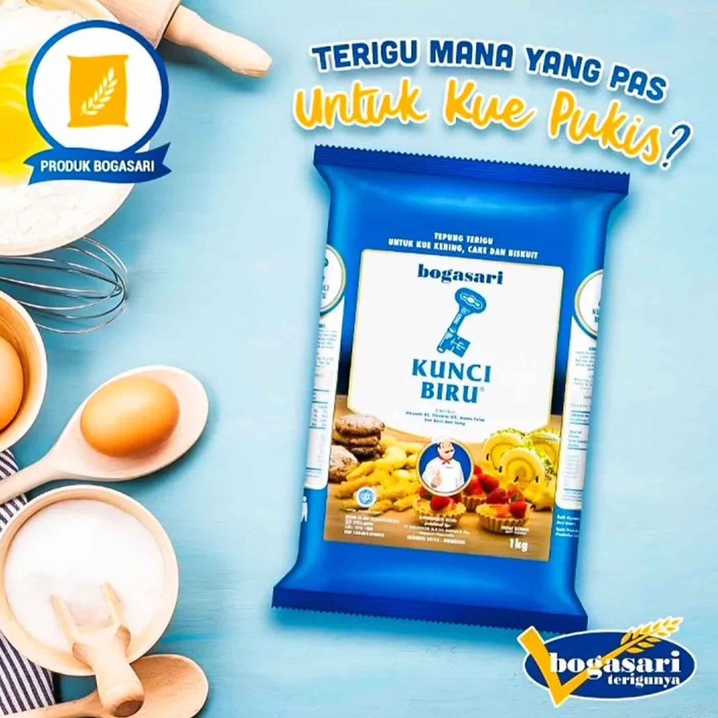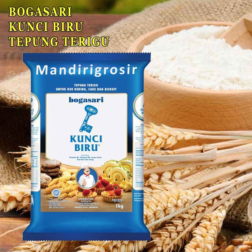 TEPUNG TERIGU KUNCI BIRU 1kg TEPUNG TERIGU KUNCI BIRU 1kg adalah tepung terigu yang cocok untuk membuat donat, soes, roti tawar, roti manis, burger/hot dog bun, mi instant, mi basah, mi kering, martabak telur, dan roti goreng. Tepung terigu Cakra Kembar dibuat dari gandum pilihan berkualitas.