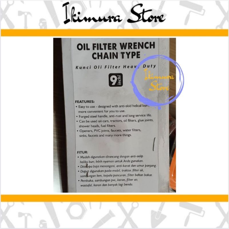 Fitur : •Mudah digunakan, dirancang dengan anti selip heliks burr, lebih nyaman untuk Anda gunakan. •Ditempa baja (Forged steel handle), anti karat dan awet. •Dapat digunakan pada motor, mobil, traktor, filter oli, sambungan lem, kepala pancuran, filter bahan bakar. •Pembuka, sambungan PVC, keran, filter air, wastafel, dan banyak lagi lainnya.