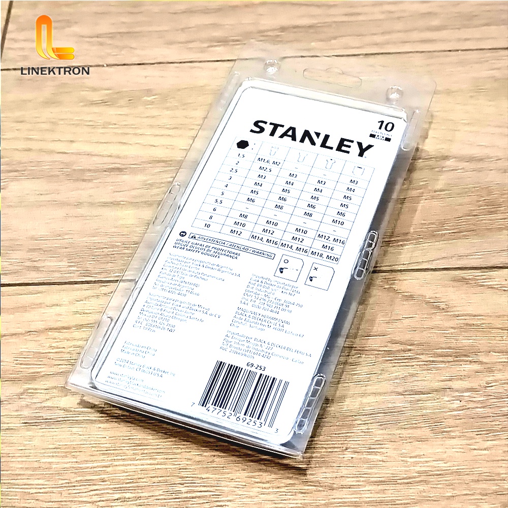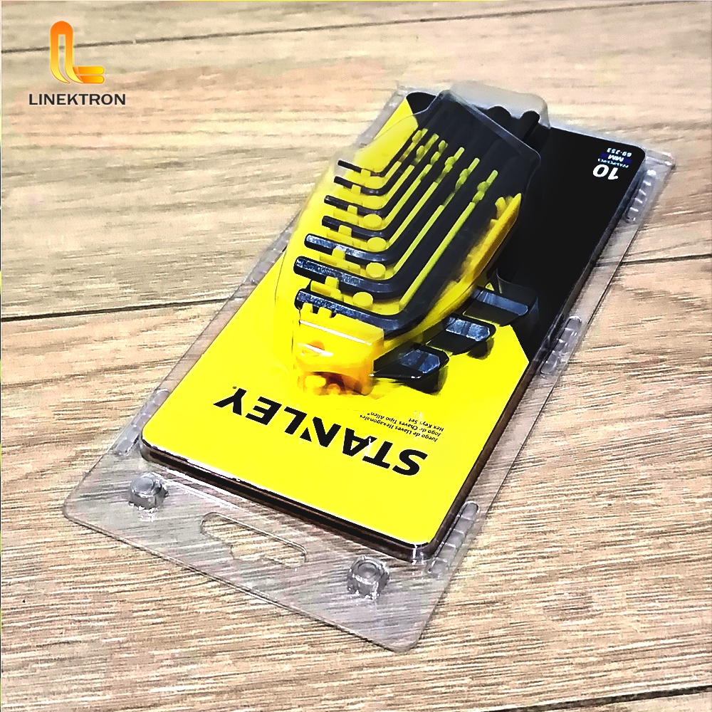 Spesifikasi produk : - Merek : Stanley - Model No. : 69-254-22 - Type of Product : Allen Standard Key Set - Content Size : 1/16", 5/64", 3/32", 1/8", 5/32", 3/16", 7/32", 1/4", 5/16", 3/8" - Items in a Pack : 10 Pcs
