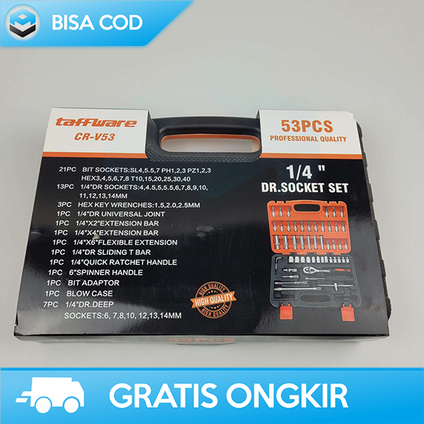 21 x Bit Socket PH1, PH2, PH3, PZ1, PZ2, PZ3, H3, H4, H5, H6, H7, H8, SL4, SL5.5, SL7, T10, T15, T20, T25, T30, T40 13 x 1/4: DR Sockets 4, 4.5, 5, 5.5, 6, 7, 8, 9, 10, 11, 12, 13, 14mm 3 x Hex Key Wrenches 1.5, 2.0, 2.5mm 1 x 1/4" DR Universal Joint 1 x 1/4" X2" Extension Bar 1 x 1/4" X4" Extension Bar 1 x 1/4" X6" Flexible Extension 1 x 1/4" Dr Sliding T Bar 1 x 1/4" Quick Ratchet Handle 1 x 6" Spinner Handle 1 x Bit Adaptor 1 x Blow Case 7 x 1/4" DR Deep Sockets 6, 7, 8, 10, 12, 13, 14mm Spesifikasi Material Chrome Vanadium Dimension Dimensi Box: 27 x 20 x 5 cm