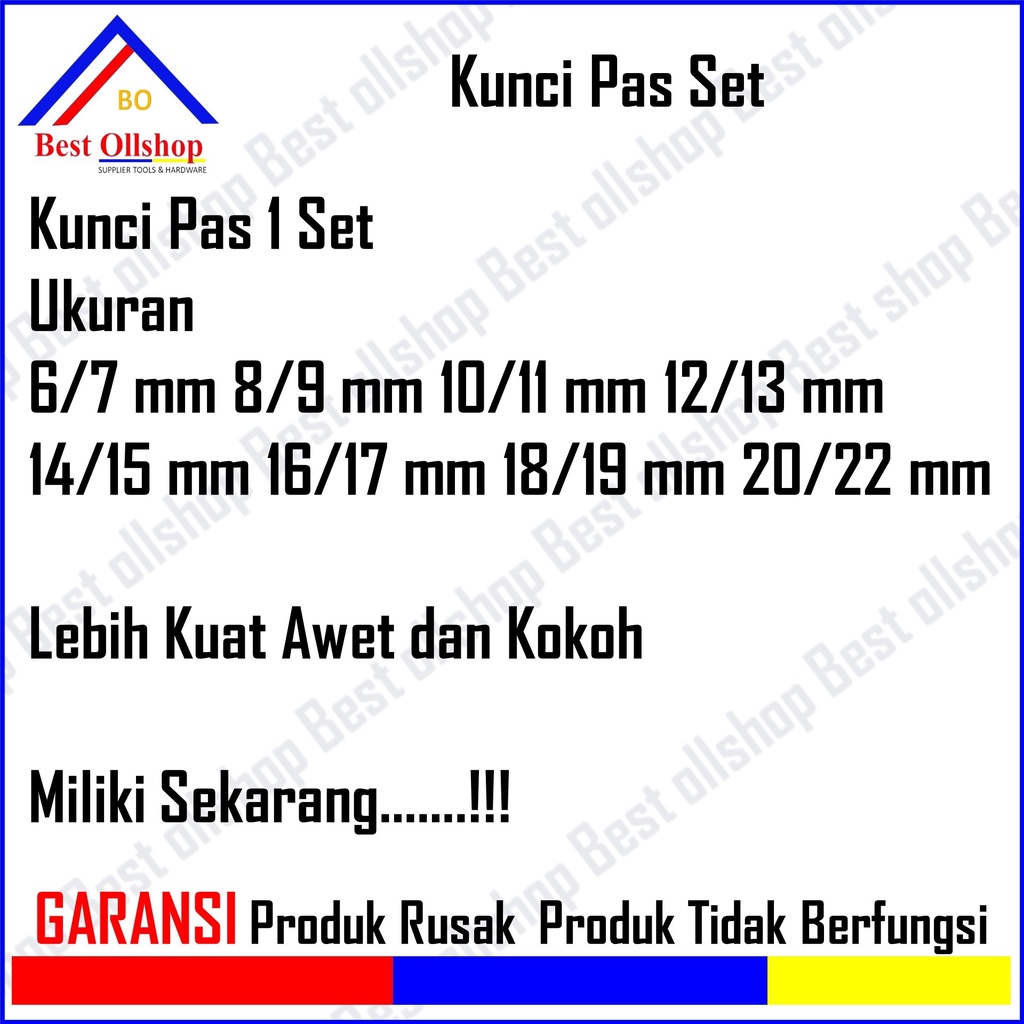 Kunci Pas 1 Set Isi 8 Pcs Ukuran => 6/7 mm => 8/9 mm => 10/11 mm => 12/13 mm => 14/15 mm => 16/17 => 18/19 mm => 20/22 mm Harga yang tertera adalah harga 1 set isi 8 pcs
