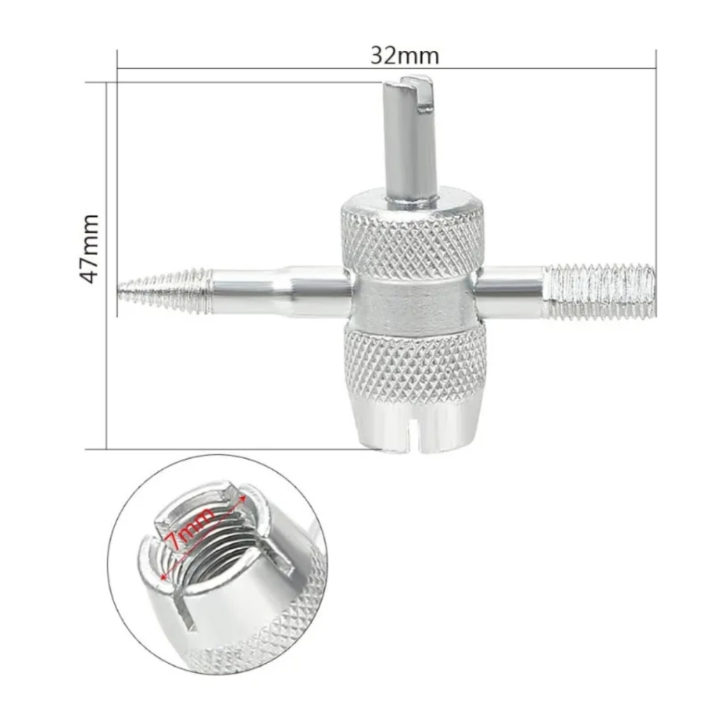 Terdapat 4 Fungsi Dalam 1 Alat : - Membuka / Menutup Pentil Ban - Mengeluarkam Kepala Pentil Saat Ban Kempes - Mengeluarkan Angin Dalam Dalam Ban / Mengempeskan Ban - Menusuk Untuk Ban Tubless Yang Bocor