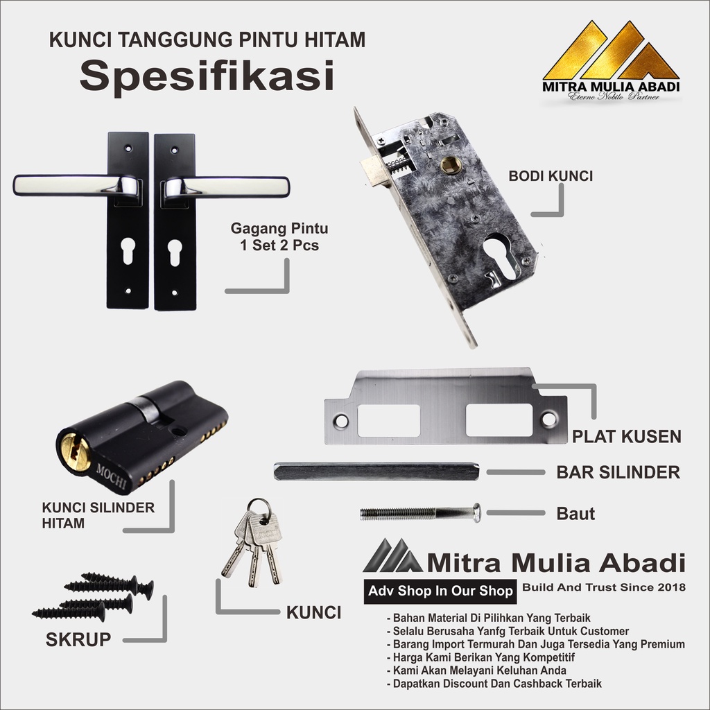 Body dan gagang kunci terbuat dari material stainless steel sehingga membuat barang menjadi kuat, kokoh dan awet. Spesifikasi : - Warna : Hitam SILVER - Model Gagang : Kotak - Panjang Body : 20 x 4.5 cm - Panjang Handle : 12.5 cm 1 Set terdiri dari 2 buah handle, skrup, baut, bar silinder, 3 buah kunci, plat kusen, 1 silinder. Barang Original. Foto sesuai dengan barang yang dijual.