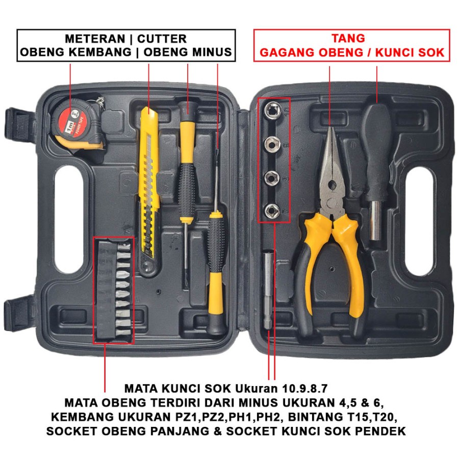 Toolset ini adalah sekumpulan alat-alat perkakas yang bisa anda gunakan untuk keperluan sehari-hari dalam memperbaiki banyak hal baik dirumah maupun di luar rumah seperti memperbaiki pintu, jendela rumah, lemari, mengukur, memotong kertas, mengencangkan baut dan banyak lainnya. Dilengkapi peralatan yang umum dipakai terdiri dari Tang, Cutter, Obeng Kembang, Obeng Minus, Meteran dan Gagang Obeng beserta Mata Obeng juga Mata Kunci Sok yang tersimpan di dalam sebuah tas kotak perkakas sehingga memudahkan saat disimpan dan bisa dibawa kemana saja dengan mudah, bahkan anda bisa membawanya di dalam kendaraan untuk keadaan darurat.