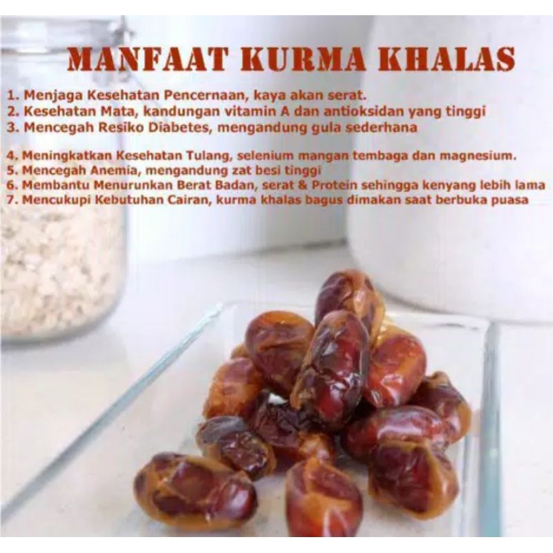 Manfaat kurma khalas 👉🏽 Mencegah rematik 👉🏽 Aman untuk penderita diabetes 👉🏽 Mencegah kanker otak 👉🏽 Mencegah penggumpalan darah 👉🏽 Mencegah insomnia 👉🏽 Mengobati demam berdarah 👉🏽 Menjaga kesehatan jantung 👉🏽 Mencegah resiko stroke 👉🏽 Meningkatkan daya ingat dan kerja otak 👉🏽 Aman untuk penderita hipertensi,DLL