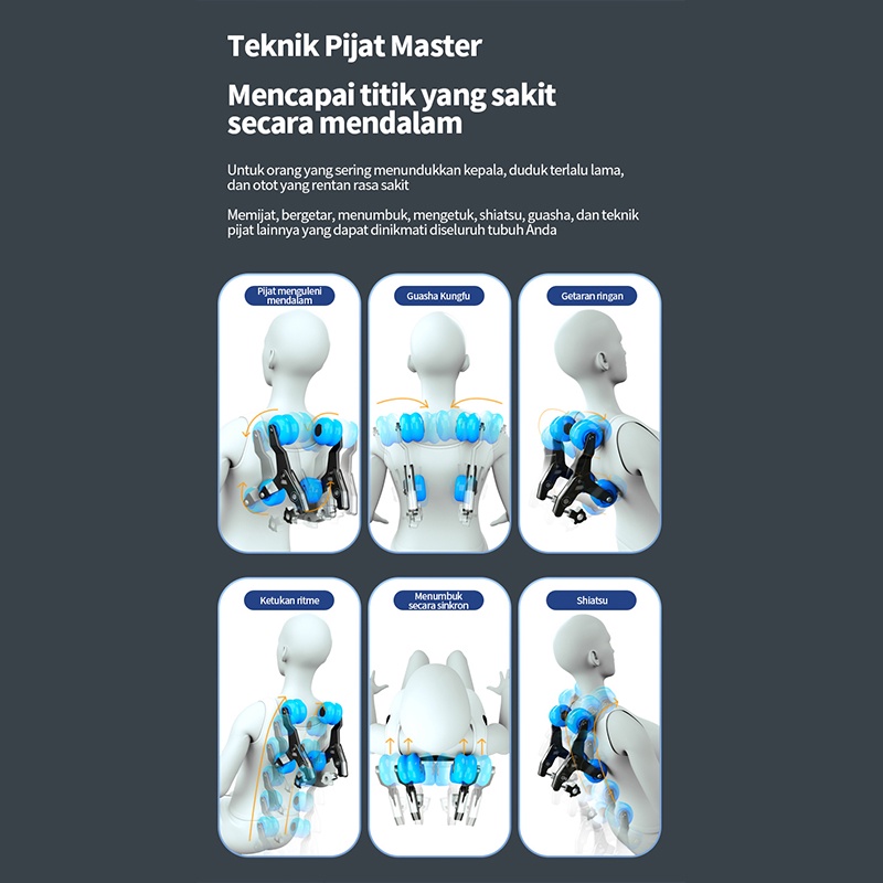 20 teknik kesehatan utama, peningkatan manusiawi. 1. All-in-one bebas instalasi,pakai setelah dikeluarkan , nikmati segera. 2, kompres panas apsintus, nikmati terapi pengobatan Cina. 3. Pengaturan waktu yang cerdas, penyesuaian waktu luang. 4. meremas telapak kaki, pijat tekanan atas, dan rilekskan meridian kaki. 5. Kompres hangat di punggung, hangat dan penuh perhatian. 6, audio Bluetooth, santai. 7. Kantong udara di kedua sisi dikompresi, pijatan rol pantat, relaksasi menetap. 8. Suspensi gravitasi nol, pengalaman tanpa bobot di luar angkasa. 9. Peregangan Thailand, peregangan nyaman, nikmati pijatan Thailand. 10. Kaki bebas mengembang dan mengerut, cocok untuk semua ketinggian. 11. Perpanjang lekuk pijatan, sesuaikan lekuk tubuh manusia, dan paskan pijatan dari ujung kepala hingga ujung kaki. 12. Pijat tubuh bagian atas yang nyaman, berbagai pengalaman pijat. 13. Kepala pijat cerdas, meniru pijatan manusia . 14. Beberapa set program pijat, pengalaman pijat yang beragam. 15. Deteksi tubuh yang cerdas, untuk memenuhi berbagai jenis pijatan tubuh. 16. Pijatan tubuh bagian bawah yang nyaman, pengalaman yang nyaman. 17. Pijat kaki dua tahap, pijat pembungkus penuh 360°. 18. Gerakan giok punggung, pijatan hangat. 19. Dorong dan meremasi 8D, pijat bungkus airbag. 20. Layar sentuh LCD ukuran besar, mudah dioperasikan.