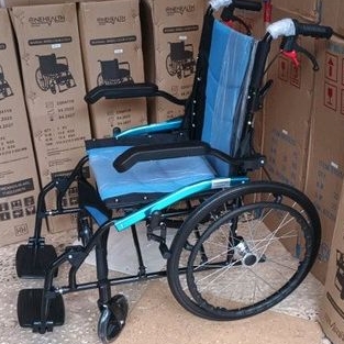 Kursi roda travel 868 alumunium Berat kursi roda 13kg Bisa di taruh dalam tas saat di bawa2... Bahan alumunium.. Bisa di lipat simpel... Ada rem tangan dan ada kuncian berenti...
