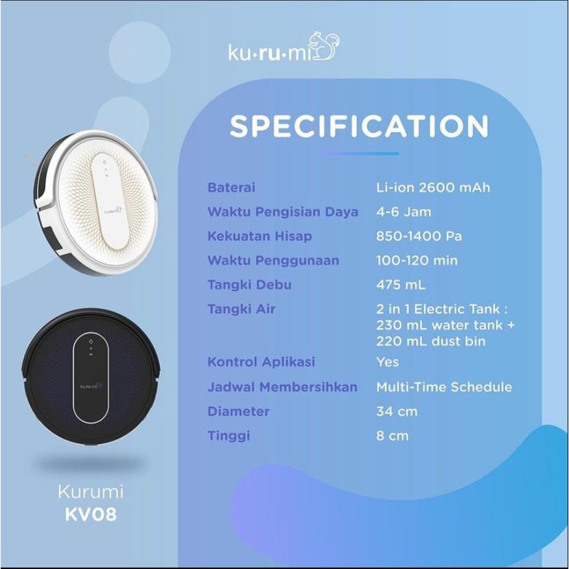 In The Box : 1 Kurumi KV 08 Robot Vacuum Cleaner (Rolling Brush, Dustbin terpasang di mesin) 1 Remote Control 1 2 in 1 Water Tank 4 Side Brush 2 Mop Cloth 3 HEPA Filter (1 di dalam tangki debu, 1 di dalam 2 in 1 water tank, 1 extra) 1 Charger With Charging Dock 1 Manual Book 1 Kartu Garansi 1 Magnetic Stripe