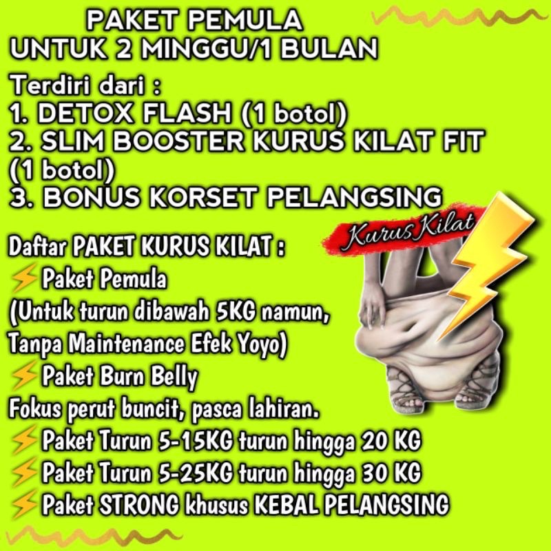 Daftar PAKET KURUS KILAT : ⚡Paket Pemula Kurus Kilat ⚡Paket Burn Belly khusus buat yang fokus perut buncit, paling cocok buat yg pasca lahiran, atau bapak2 yang perut nya udh kayak ibu hamil 😁 ⚡Paket Turun 5-15 bisa turun sampai 20 KG ⚡Paket Turun 5-25 bisa turun sampai 30 KG ⚡Paket STRONG khusus KEBAL PELANGSING