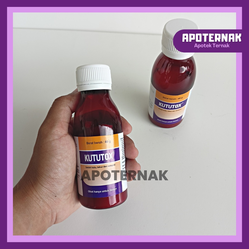KUTUTOX adalah serbuk anti kutu yang dapat ditebarkan langsung atau dicampur dengan air untuk disemprotkan langsung ke hewan ternak atau kandang.