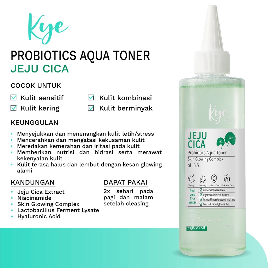 Toner tipe air dengan Jeju Cica yang diformulasikan dengan Probiotics Complex dan Skin Glowing Complex untuk menyegarkan, menyejukkan dan menghidrasi kulit setelah dibersihkan.