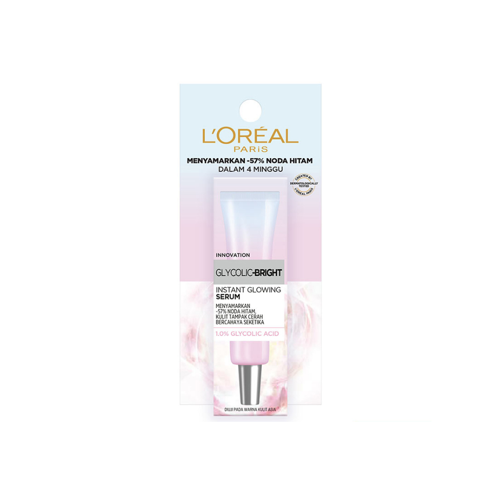 Loreal Paris Glycolic-Bright -Bright Instant Glowing Serum 7,5ml menyamarkan -57% noda hitam dan mencerahkan untuk kulit tampak glowing lebih merata
