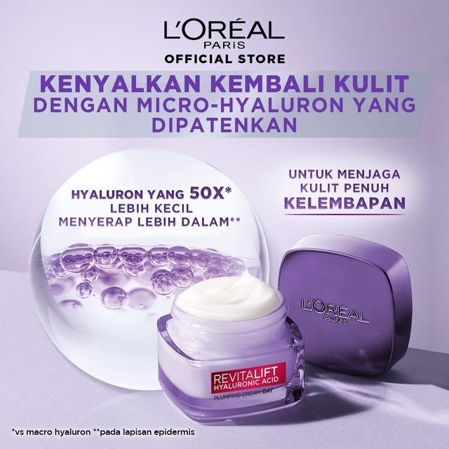 Diformulasikan dengan teknologi hyaluronic acid yang dipatenkan oleh L'Oreal Paris, micro hyaluron dalam L'Oreal Paris Hyaluronic Acid Plumping Day Cream berukuran 50X* lebih kecil daru hyaluron pada umumnya, menyerap lebih dalam untuk kelembapan yang tahan lama. Setelah 1 kali pemakaian, kulit tampak lebih halus dan lembap; garis halus tersamarkan dan kulit terasa lebih kenyal hari demi hari.
