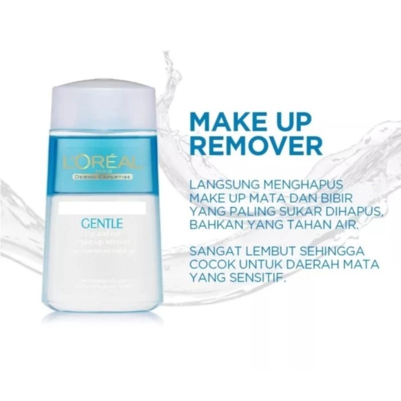 LOreal Paris Dermo Expertise Gentle Lip and Eye Makeup Remover Pembersih Wajah [125 mL], pembersih wajah yang berfungsi untuk membersihkan make-up kedap air di bagian bibir dan mata secara menyeluruh. Pembersih ini sangat lembut di kulit Anda dan cocok untuk mata yang sensitif - Terasa lembut di kulit - Formula unik yang secara instan membersihkan bagian mata dan bibir walau make-up kedap air dan cocok untuk mata sensitive