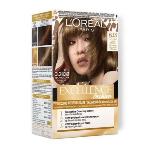 Highlight Product\nMengandung Shine Complex yang menghasilkan warna rambut berkilau \nHasil tahan lama \nRambut tetap kuat dan terasa halus \nMenutup uban dengan sempurna\nWarna :#6.13 Golden Nude\n\n\nL'Oreal Paris Excellence Fashion #6.13 Golden Nude\nL'Oreal Paris memperkenalkan varian terbaru dari Exclusive Fashion Colors yang terinspirasi dari kehidupan Paris yang glamor. Excellence Fashion memberikan Anda warna yang intense. Kondisionernya diperkaya dengan Shine Complex. Kandungan Ceramide, Amino Acid, dan Collagen membantu melindungi dan merawat kekuatan rambut. Rambut terasa lembut dan terlindungi dari rambut patah akibat penyisiran.\nPewarna rambut yang melindungi rambut sebelum, saat, dan sesudah pewarnaan. Excellence Fashion diperkaya dengan:\n(1) Shine Complex \nUntuk refleksi cahaya pada rambut yang lebih indah\n(2) Intensif Pigments \nUntuk warna rambut yang lebih tahan lama \n(3) Triple Care Formula\nUntuk melindungi, menjaga kekuatan, dan menutrisi rambut yang diwarnai .\n\nCARA PENGGUNAAN : \n1. Kenakan sarung tangan yang tersedia dalam kemasan L'Oreal Excellence.\n2. Buka ujung botol developer dan lepaskan penutup aplikator.\n3. Tusuk bagian atas tabung pewarna dengan ujung penutupnya.\n4. Masukkan semua isi tabung pewarna ke dalam botol developer dan pasang kembali penutup developer.\n5. Tutup ujung botol developer dengan jari yang sudah terbungkus sarung tangan dan kocok sampai kedua bahan tercampur rata.\n6. Pasanga handuk di atas bahu agar pakaian terlindung dari bahan pewarna.\n7. Sisirlah rambut dan oleskan serum precolor hingga ujung agar ranbut terlindung selama proses pewarnaan. Tunggu dua menit sebelum mewarnai dan jangan membilas serum.\n8. Gunakan ujung aplikator untuk mengoleskan zat pewarna ke akar rambut.\n9. Oleskan zat pewarna ke bagian rambut yang lain secara menyeluruh menggunakan jari yang terbungkus sarung tangan atau sisir aplikator.\n10. Diamkan rambut selama 30 menit dan kemudian bilas sampai air benar-benar jernih.\n11. Gunakan kondisioner pelindung yang tersedia dalam kemasan pewarna rambut dan biarkan selama dua menit.\n12. Bilas dan tata rambut seperti biasa.\n\nShelf Life: 2 tahun.\nBPOM: NA11171002270.