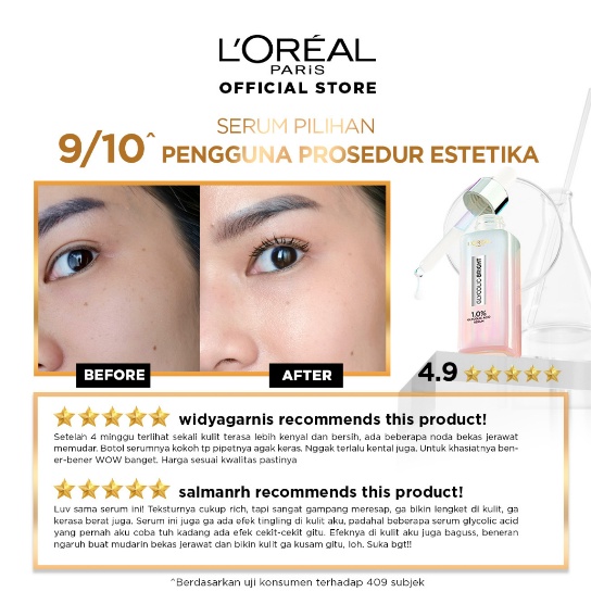 L'Oreal Paris Glycolic Bright Instant Glowing Face Serum - 15/30ml Loreal Glyco Acid AHA Exfoliating Dark Spot dan Bekas Jerawat Glycolic Bright Instant Glowing Face Serum dengan konsentrasi optimal 1% Brightening Glycolic Acid, menyamarkan -57% noda hitam*, dan mencerahkan untuk kulit tampak glowing lebih merata. Diuji oleh ahli kulit dan terbukti pada kulit Asia. Diformulasikan dengan 1% Brightening Glycolic, terbukti secara klinis mencerahkan kulit seketika dan menyamarkan 57% noda hitam*. Diuji oleh ahli kulit dan terbukti pada kulit Asia.