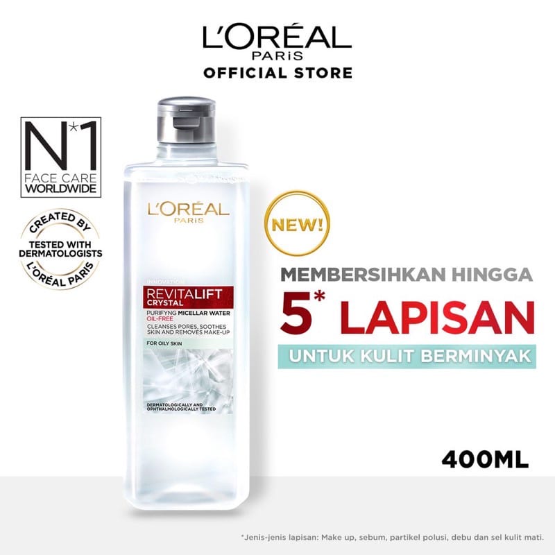 L'oreal paris revitalift crystal purifying micellar water. Micellar Water untuk membersihkan sampai ke pori-pori, menghapus make up, dan menenangkan kulit, sangat cocok untuk kulit berminyak. L'Oreal Paris Revitalift Crystal Purifying Micellar Water hadir dengan pembersihan pori 5x lebih dalam dan secara efektif menghilangkan riasan, sebum berlebih, debu, partikel, sel kulit mati agar kulit dapat cerah sebening kristal.