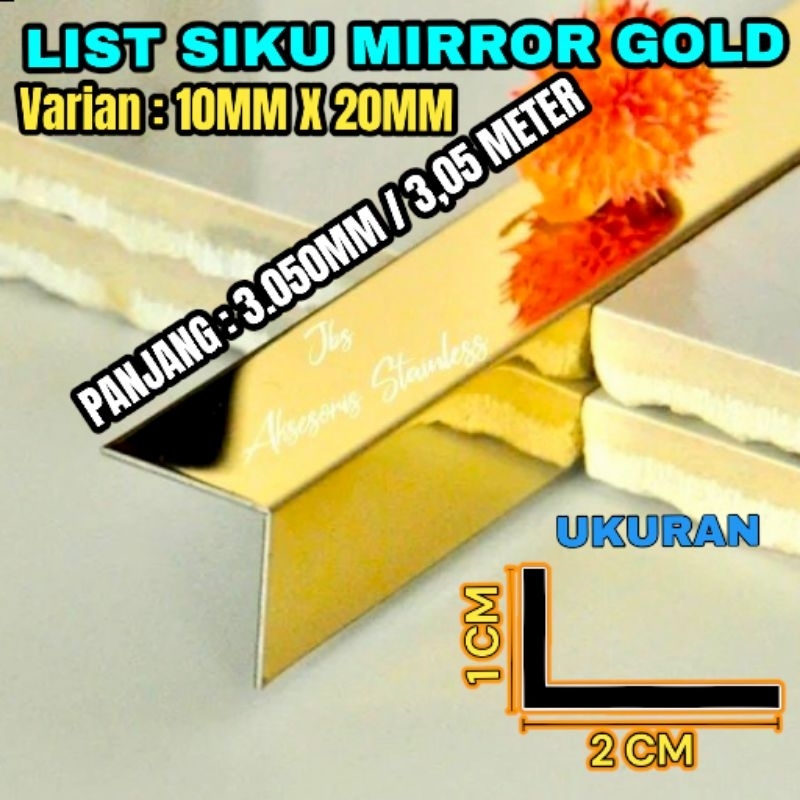 LIST SIKU VARIASI / DEKORASI INTERIOR/KACA/ALKRILIK/FURNITURE DLL... UKURAN 10MMX20MM PANJANG : 305CM/3.050MM TEBAL : 0.8MM FINISHING : MIRROR GOLD BAHAN STAINLESS STEEL 201 TIDAK NEMPEL MAGNET...
