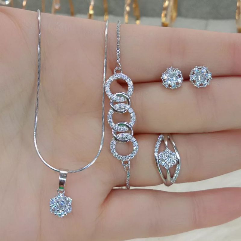 Bahan: Titanium Batu: Batu yang dipakai adalah batu Zircswar, tampilan persis Batu Asli, JERNIH, MEWAH & BERKILAU Ukuran Cincin: 5, 6, 7, 8 ( 5,size kecil,6 size kecil, 7 size sedang, 8 dan ) Ukuran Gelang: Adjustable Panjang Kalung: 45cm (sejajar dengan tulang leher) Tulis Ukuran yang kamu inginkan di catatan, jika tidak menulis ukuran akan di kirim size standard
