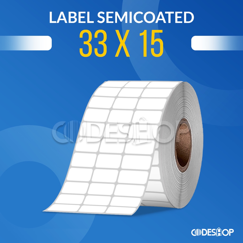 Label Sticker Semicoated memiliki spesifikasi : - Bahan : Semicoated - Lebar : 33 mm - Tinggi : 15 mm - Baris : 3 Line - Isi : 10.000 pcs/roll - Core : 1 inch ( Kecil ) - Potongan : Perforasi / ada garis potong