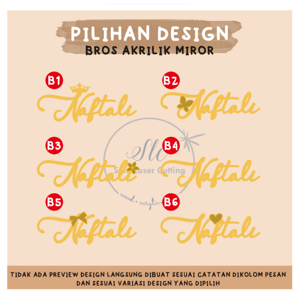- Bros nama dari bahan akrilik gold (1,5mm) + akrilik bening (1,5mm) - Tinggi Bros 1-2cm, Panjang Bros menyesuaikan banyaknya huruf - Khusus 1 huruf (inisial) tinggi Bros 3cm, panjang bros 2-3cm. - Nama boleh pesan sesuai permintaan - Harga murah karena kami langsung memproduksi sendiri - Proses pembuatan 1-2 hari sesuai antrian Dengan mesin canggih terkini.