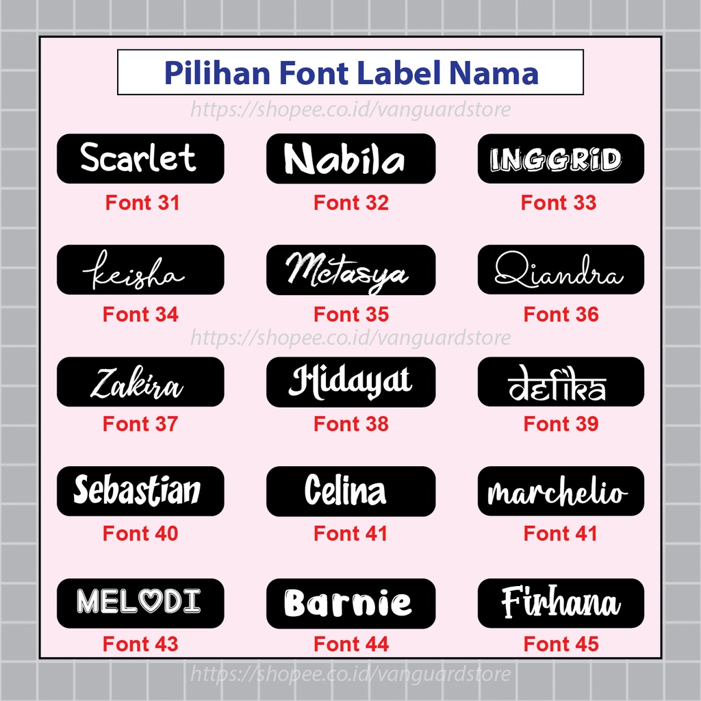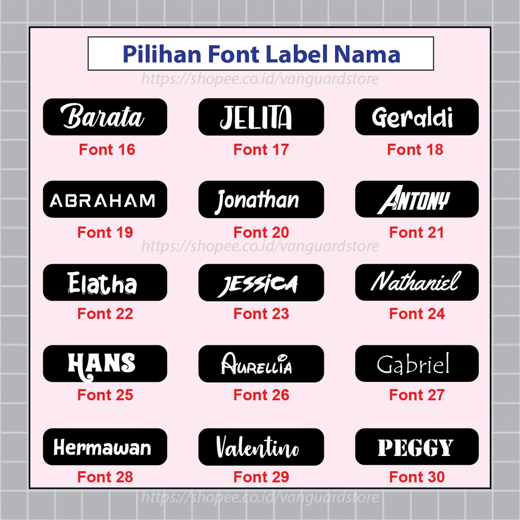 - Tentukan NAMA yang akan dicetak, KODE FONT, WARNA BACKGROUND, SIZE ( S / M / L ) - Saat Order Pilih Varian Ukuran Label - Mohon cantumkan FORMAT ORDER / DATA ORDERAN di Note saat Checkout - Tanya2 / Konfirmasi Custom Warna dan Font di Chat